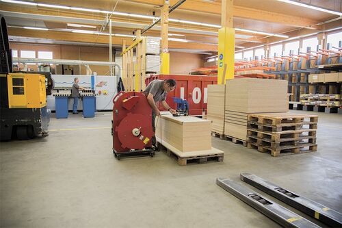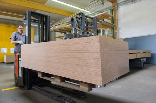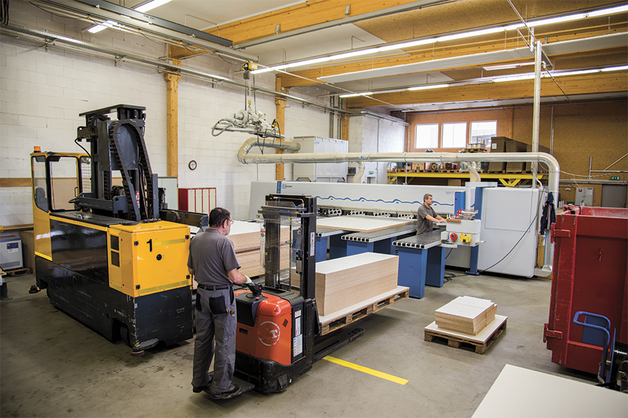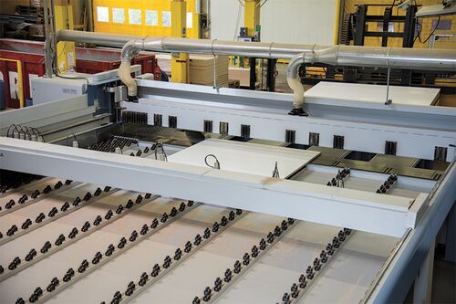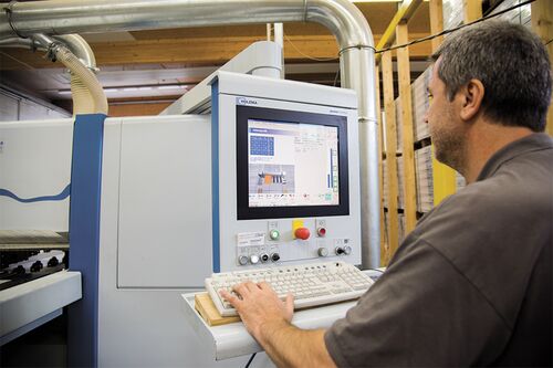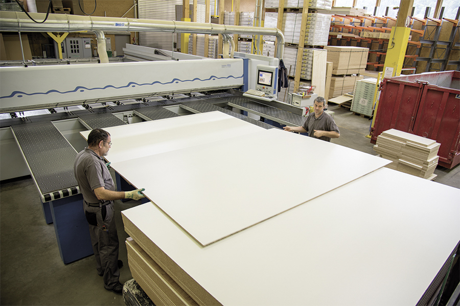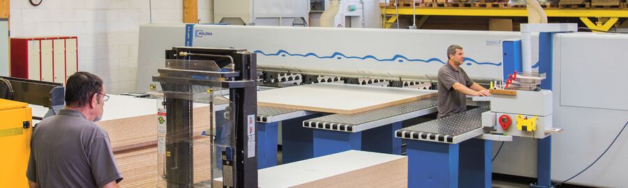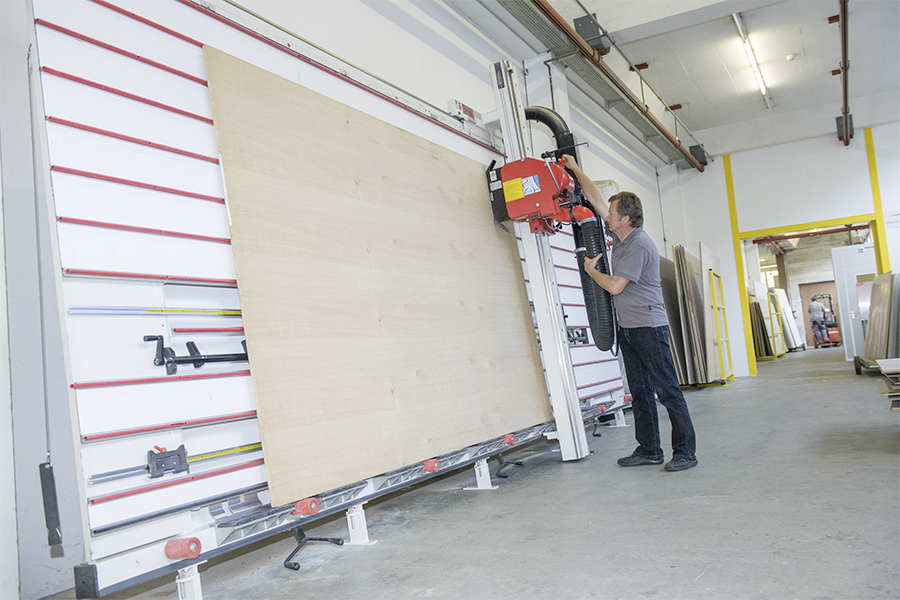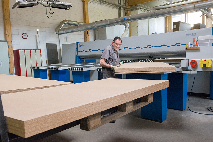 Mit einer modernen Zuschnitt-Anlage werden die Platten auf gewünschte Formate geschnitten. Die Kunden übermitteln die Daten im Normalfall elektronisch auf die Maschinensteuerung.